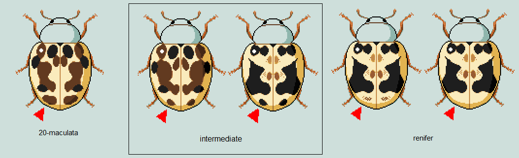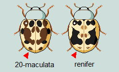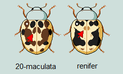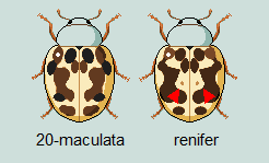 As you can see from the diagram above, there is a tendency for 20-maculata to show a specific bicoloured pattern. While most of the markings are brown, there are 6 spots in particular which are black. That's the basal pair of spots at the front-center of the elytra, and 2 spots on each side near the legs. On renifer however, the main marking pattern is uniform brown or black all over. On some renifer the front row of 4 markings are brownish and paler, so be aware of that. It is not "bicolouration" itself that is important, but what is and what isn't.